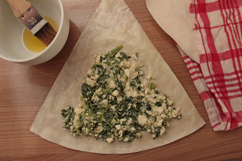 Spinatblätter vom Stiel befreien, gut waschen (gerne auch mehrmals – Sand zwischen den Zähnen macht sich nicht besonders gut) und abtropfen lassen. Derweil Zwiebeln in feine und Knoblauch in sehr feine Würfel schneiden und in einer großen Pfanne mit 1 EL Olivenöl anbraten. Spinat hinzufügen und kurz durchrühren. Deckel auf die Pfanne und den Spinat zusammenfallen lassen. Danach mit frisch geriebener Muskatnuss, Salz, Pfeffer und Chilipulver abschmecken. Aber Achtung: macht es nicht zu salzig, da der Schafskäse schon sehr viel Salz enthält. Den Spinat in eine Schüssel umfüllen und kurz abkühlen lassen.