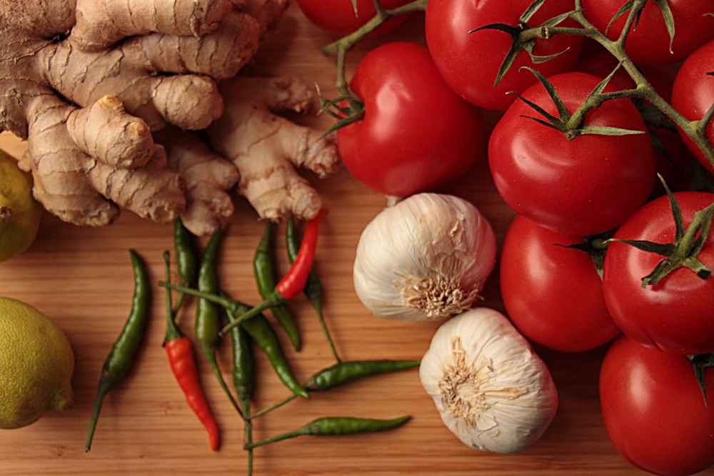 Während das Fleisch mariniert könnt ihr schon die Sauce zubereiten: Dazu wascht ihr die Tomaten und schneidet sie in Viertel. Gebt sie mit 125 ml Wasser in einen großen Topf und schaltet den Herd ein. Schneidet den Ingwer und den Knoblauch in feine Scheiben und drückt die Kardamon-Kapseln an (das geht am besten mit der Breitseite einer Messerklinge: darauflegen und mit dem Handballen darauf schlagen). Fügt nun den Ingwer, den Knoblauch, die Kardamon-Kapseln und das Lorbeerblatt zu den Tomaten hinzu. Lasst das Gemisch einmal aufkochen und köchelt es dann bei mittlerer Hitze so lange, bis die Tomaten vollständig zerfallen sind. Jetzt müsst ihr euch auf die Suche nach dem Lorbeerblatt begeben. Ist dieses gefunden und herausgefischt, püriert ihr die Tomaten mit einem Mixstab, bis es nicht mehr stückig ist. Bestückt eine Schüssel mit einem Sieb und passiert die Tomaten – so entsteht ein schön homogenes Tomatenpüree.