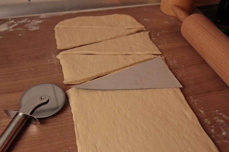 Macht euch aus Pappe eine Schablone für ein Dreieck mit einer 10 cm langen Basis und jeweils 20 cm Seitenlängen. Rollt den Teig 5 mm dick und so breit, wie die Schablone ist, aus. Aus einem Kilogramm Plunderteig bekommt ihr ca. 20 Croissants. Wenn ihr also nicht so viele Gäste habt – oder nicht so viele Croissants auf einmal verdrücken möchtet –, könnt ihr auch nur die Hälfte des Teigs verwenden und den Rest einfrieren. Lasst den Teig kurz ruhen, damit er sich entspannt.
