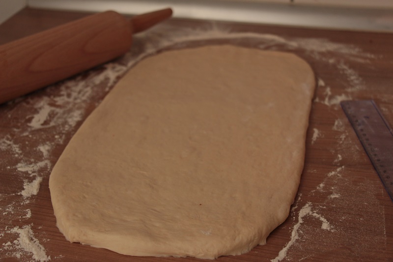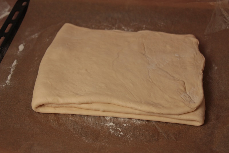 Dreht nun den Teig um 90 Grad und rollt ihn gleichmäßig zu einem Rechteck mit den Maßen 20×90 cm aus. Faltet nun das obere Drittel (=30 cm) des Teiges nach unten Richtung Mitte und klappt dann das untere Drittel darüber. Der Teig hat nun die Maße 20×30 cm.