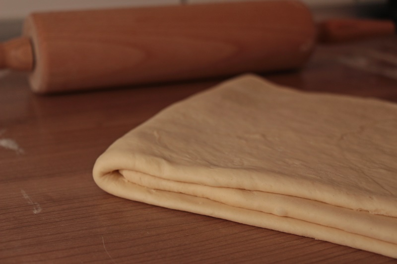 Tipp: Beim Teig ausrollen ist ein wenig Fingerspitzengefühl gefragt. Drückt nicht zu fest beim Rollen, denn die einzelnen Schichten, die durch die Butter getrennt werden, sollen nicht zerstört werden. Bei mir hat sich durch die Hefe allerdings ab und zu eine Blase gebildet, die ich vorsichtig geöffnet habe. Das hat der Luftigkeit der Croissants keinen Abbruch getan ;)