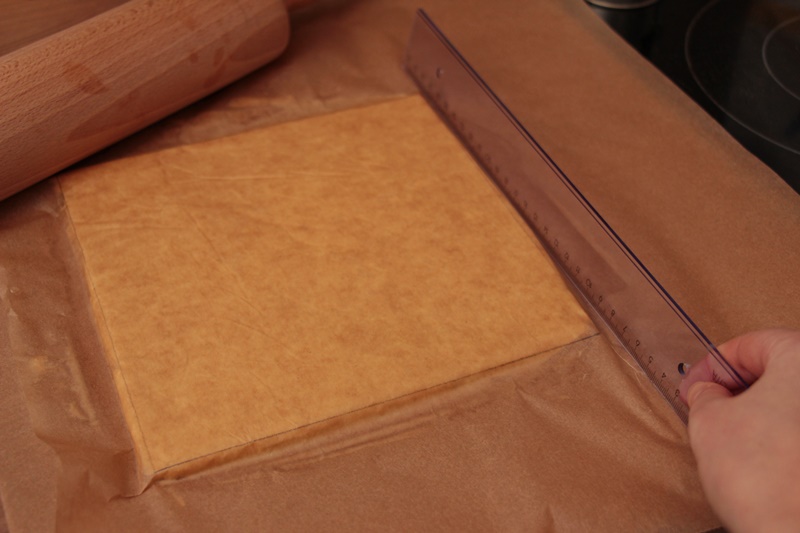 Bestäubt den Teig nun mit ein wenig Mehl und gebt ihn auf ein mit Backpapier bestücktes Blech und lasst ihn für weitere 30 Minuten im Kühlschrank ruhen. Bedeckt ihn dabei mit Frischhaltefolie, damit er nicht austrocknet.