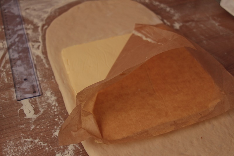 Kurz vor Ende der Ruhezeit könnt ihr die Butter wieder aus dem Kühlschrank nehmen. Sie sollte nicht zu weich, aber auch nicht zu fest sein. Rollt den Teig nun auf einer bemehlten Arbeitsfläche auf die Maße 20×40 cm aus. Legt die Butter in die Mitte des Teigs und klappt den Teig über die Butter. Drückt den Rand an allen Seiten gut zusammen, bis die Butter komplett vom Teig umschlossen ist.