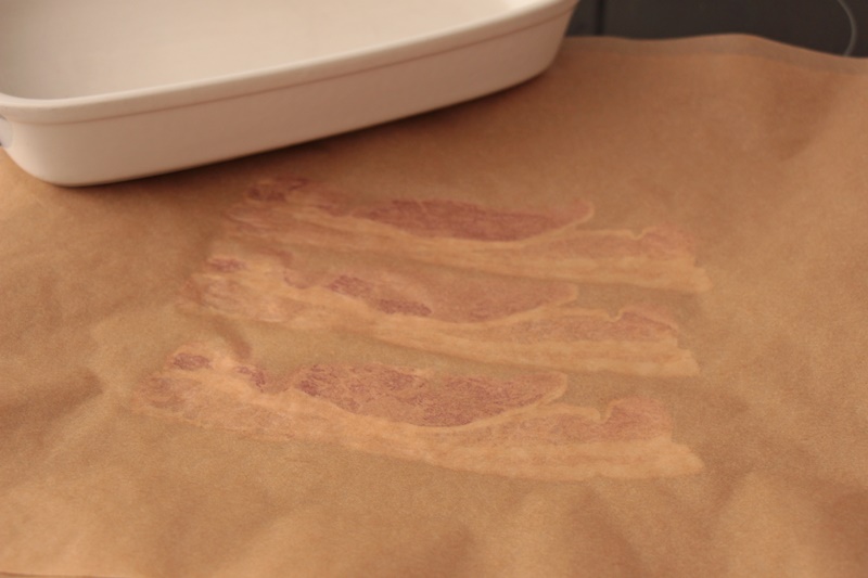 Zuerst bereitet ihr die Speckchips zu: Heizt dafür den Backofen auf 180°C (Umluft) vor. Bestückt ein Blech mit Backpapier und legt die Speckstreifen flach nebeneinander. Legt ein zweites Backpapier darüber und beschwert die Streifen mit einem zweiten Blech oder einer Auflaufform. So werden sie schön flach und gleichmäßig knusprig. Gebt das Blech in den Backofen und lasst die Chips 10 bis 15 Minuten backen.