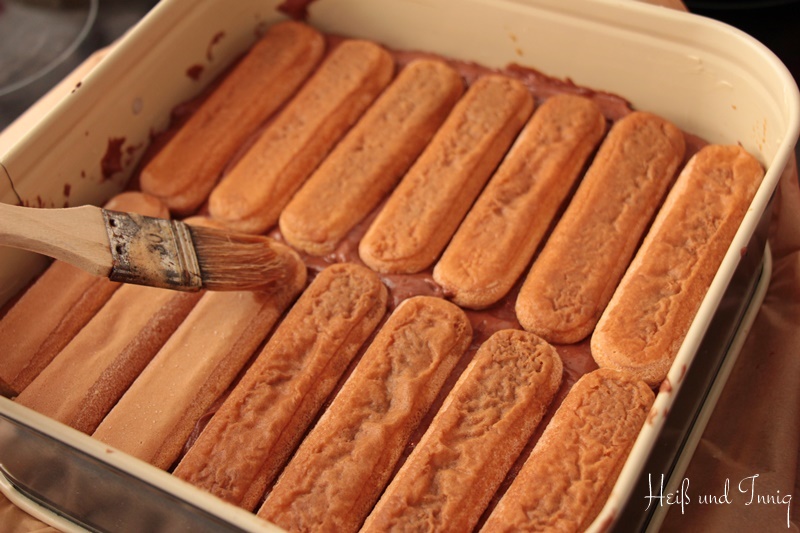 Gebt nun drei Viertel des Teiges in die Form und belegt ihn dicht mit Löffelbiskuits. Achtet dabei darauf, dass die zuckrige Seite nach unten zeigt. Drückt die Biskuits leicht in den Teig und bestreicht sie mithilfe eines Pinsels mit Espresso. Wiederholt den Vorgang bis der Kaffee aufgebraucht ist (Achtung: ab der 2. Runde eher tupfen als streichen, sonst macht ihr die Löffelbiskuits kaputt).