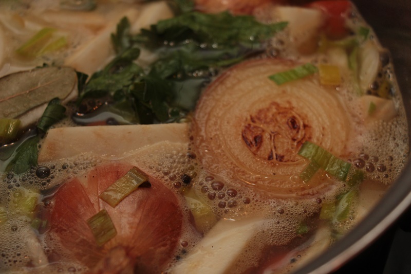 Zuerst einmal wascht und schält ihr das Gemüse. Schneidet es bis auf die Zwiebeln in ca. gleich große Stücke. Entfernt nun, falls es nötig ist die äußerste Schicht der Zwiebeln, lasst aber die übrige (braune) Schale dran. Halbiert sie quer und drückt die Schnittstellen in eine heiße Pfanne, bis diese angeröstet sind. Nun erhitzt ihr in einem großen Topf das Rapsöl und schwitzt das ganze Gemüse (bis auf die Zwiebeln) darin an. Gebt die Zwiebeln, die Petersilie sowie die Gewürze hinzu und gießt das Gemüse mit soviel Wasser auf, dass alles bedeckt ist (ca. 2 bis 2,5 Liter). Lasst den Fond einmal aufkochen, reduziert dann die Hitze und lasst ihn mit geschlossenem Deckel bei niedriger Temperatur ca. 1 Stunde köcheln. Anschließend könnt ihr den Fond mithilfe eines mit einem Mulltuch ausgelegten Siebs passieren.