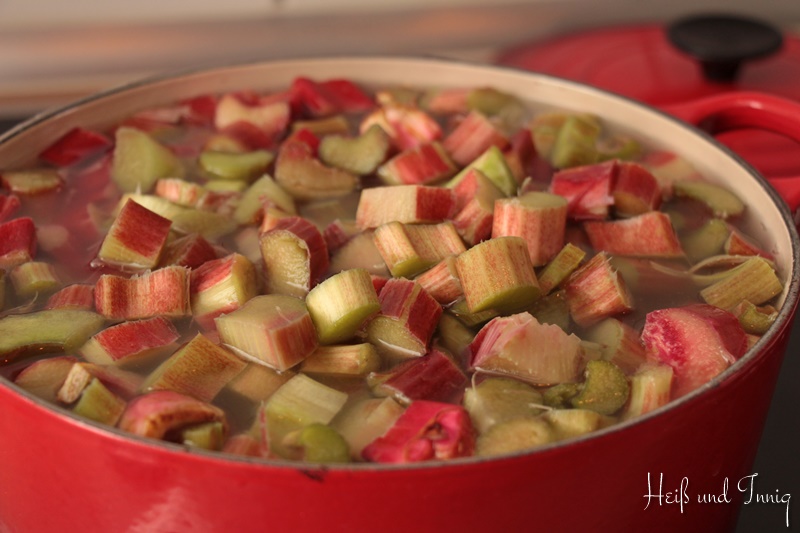 Neben der Variante, den Rhabarber zu zuckern und einzukochen, habe ich mich hier für die Variante entschieden, den Rhabarber in Wasser zu kochen, auszudrücken und zusammen mit Zucker und Gewürzen einzukochen.